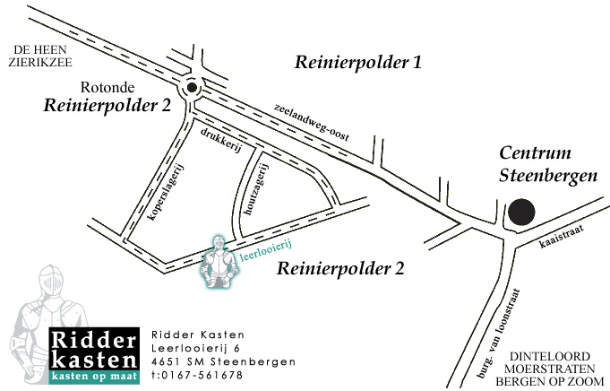 Ridder kasten kasten op maat vindt u op bedrijventerrein Reinierpolder in Steenbergen. Goed te bereiken en ruime parkeergelegenheid.